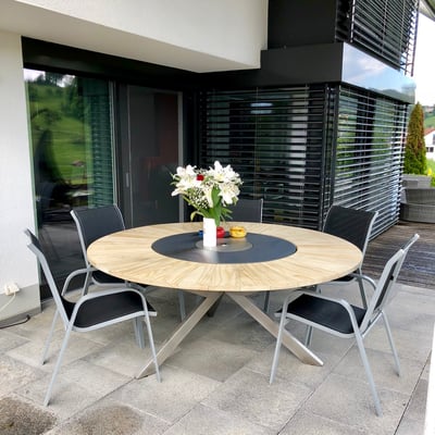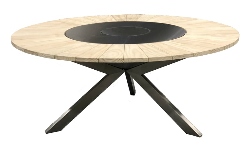 der Feuertisch artOur ist mit einem, aus Edelstahl her- gestelltem Untergestell aus- gestattet. alles verschweisst. die Tischplatte aus bestem Accoya Holz ist in 36 Segmente aufgeteilt, welche auch einzeln ersetzt werden können. die Grillfläche, das Highlight am Feuertisch ist ebenfalls aus Edelstal hergestellt, 10mm stark und weist eine Grösse von 1000mm auf. genügend Platz bietet der artOur II für 8 Personen.
