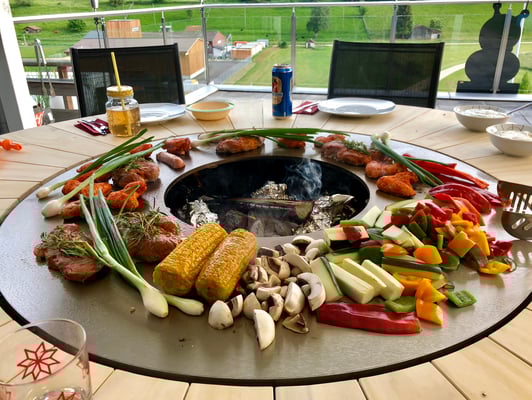 der Feuertisch, eine Kombination aus Grillstelle, bekömmlichem Essen. direkt am Tisch zubereiten und gesellig am Feuer sitzen. wer kennt und liebt nicht den altbekannten Tischgrill? ein Elektro-Ofen mit Stahl oder Steinplatte... für Alle Liebhaber des Tischgrills ist der Feuertisch ein Traum! geniessen Sie feine Gemüse-, Fleisch- oder Fischgerichte direkt vor Ihnen zubereitet. oder wie währe es mit einem feinen Raclette? alles kein Problem, der Feuertisch!